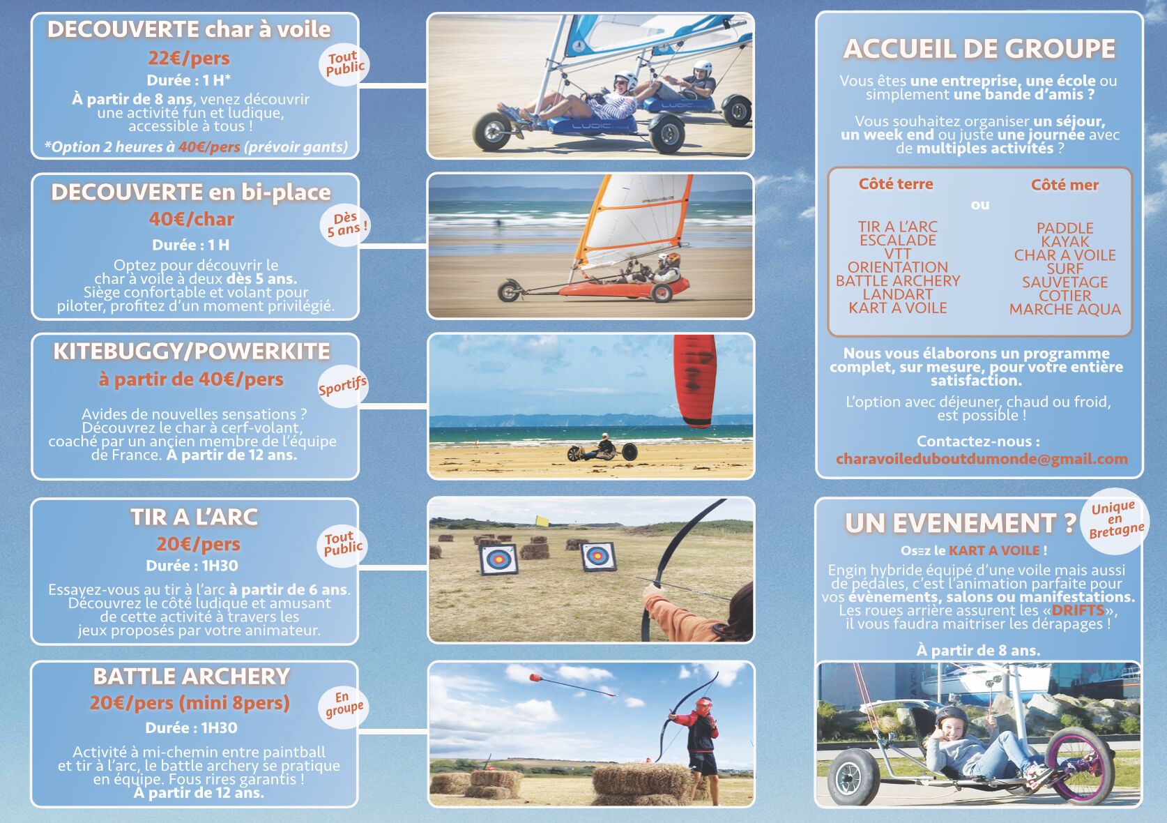 Qu’a cela ne tienne ! on vous propose également du tir à l’arc et du battle archery chez char à voile du bout du monde. Et si vous souhaitez pratiquer une autre activité comme du surf, du kayak du paddle ou encore de la marche aquatique, nous serons vous aiguiller vers les meilleurs 😉