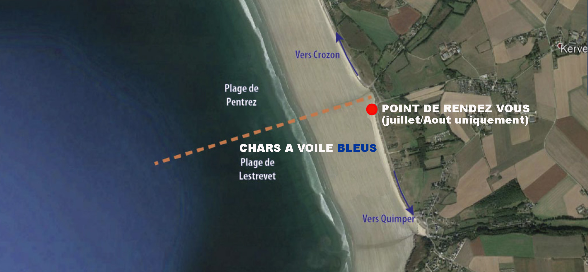 A partir du 1er juillet, et jusqu’au 31 aout, l’école de char à voile dispense les cours au milieu de la plage de Lestrevet/Pentrez, comme sur les photos ci dessous :