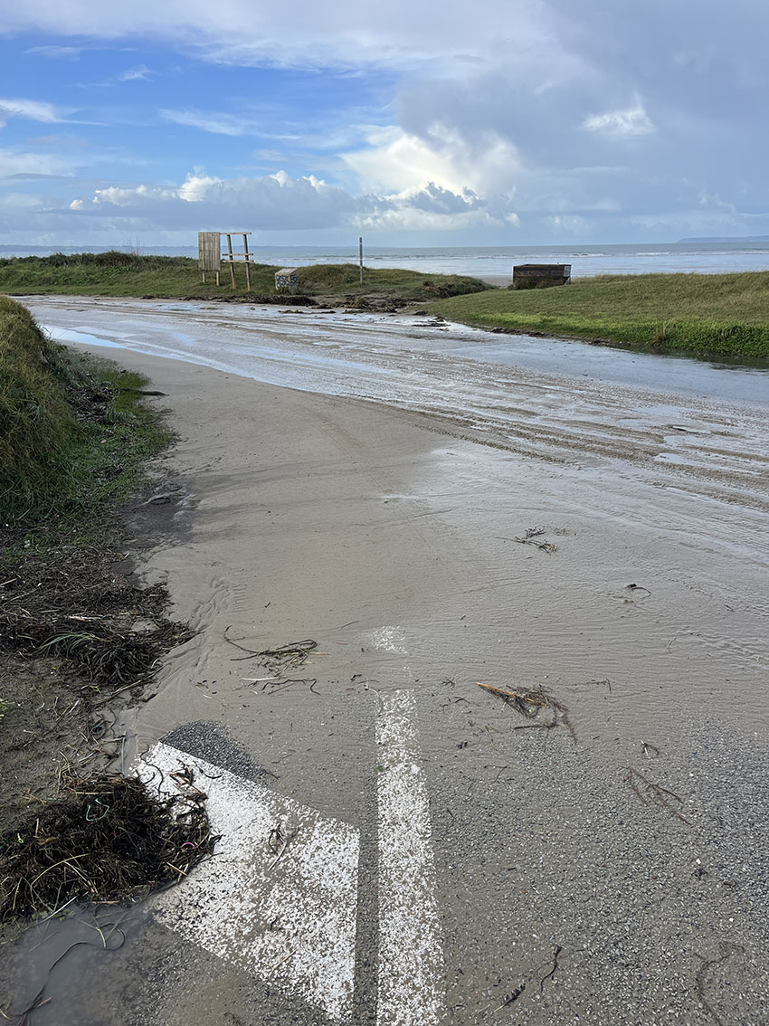 La mer s’est toutefois retrouvée sur la route à de nombreux endroits comme ici au niveau du Dour Frout, lieux de départ des chars à voile en période estivale :